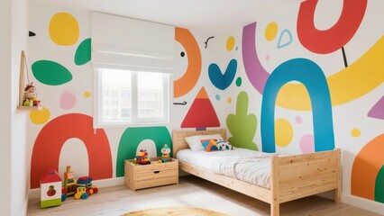 A children's room with bright colors and childlike decorations. The combination of wall paintings, toys and simple furniture creates a lively and warm growth space.
