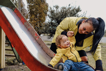 Mom with a baby walks in the park in autumn weather. Slides for kids. Children's laughter, a walk in the fresh air