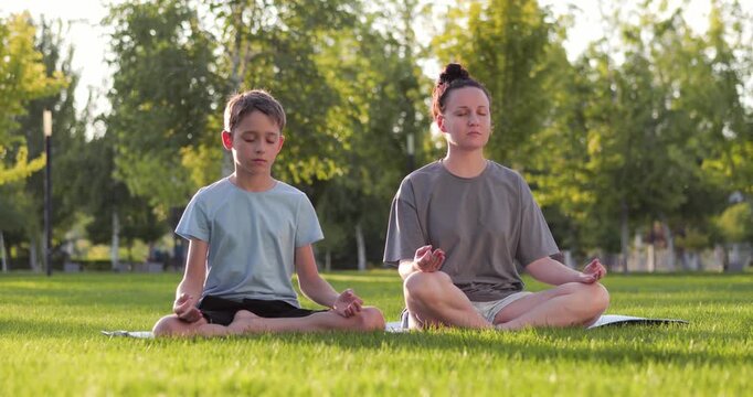 Mother and child yoga in green park mother and child meditating on yoga mat under soft sun rays green grass backdrop nature mindfulness moment serene bonding mother and children
