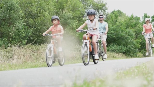 Happy ethnic family father teaches child  son  to ride bike in park  .