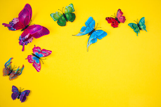 Decorative butterflies on a bright yellow background. The concept of the spring-summer season.