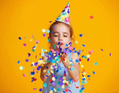 happy birthday child girl with confetti on yellow background.