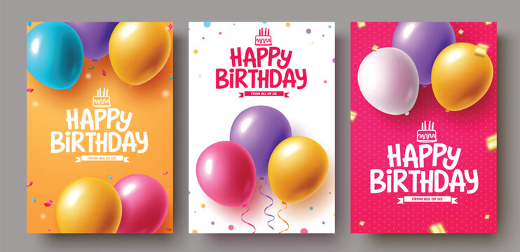 Happy birthday vector poster set design. Birthday greeting text with balloons elements decoration for postcard lay out collection. Vector illustration birthday poster design.