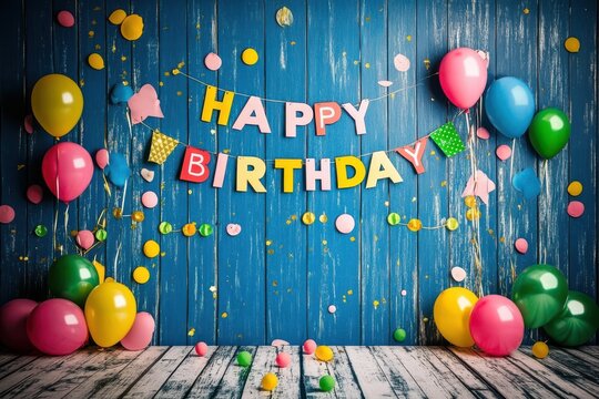 A vibrant birthday party scene with colorful balloons, confetti, and a banner.  The backdrop is a distressed blue wooden wall.  A white wooden floor is in the foreground