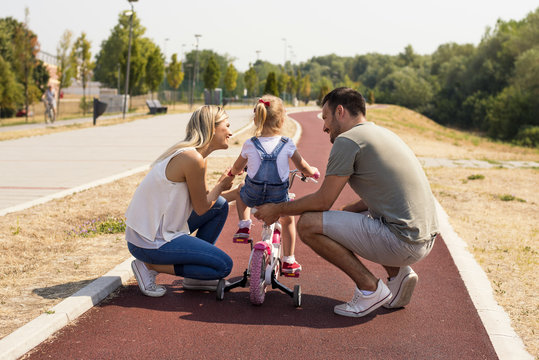 Kids first bike. Child learning to ride bike. Kid riding bike in a helmet. Child with a childs bike and in protective helmet. Articles on safety and summer activity. Happy kid boy having fun in park.