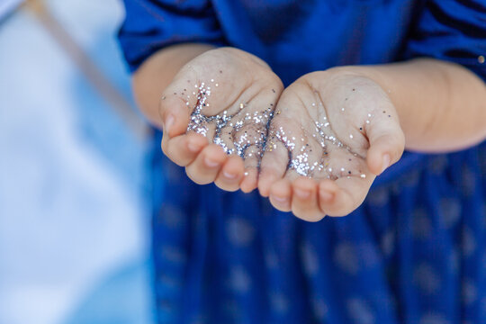 Silver glitter sparkles on childs hands