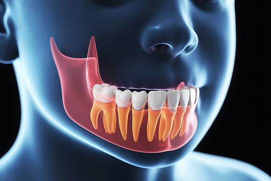 3D scientific illustration of a childs dental jaw development showing growing teeth and bone structure for orthodontic education and pediatric dentistry research