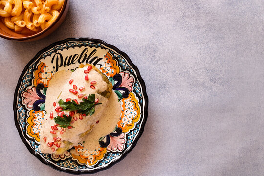 Authentic Mexican chiles en nogada with stuffed peppers and walnut sauce