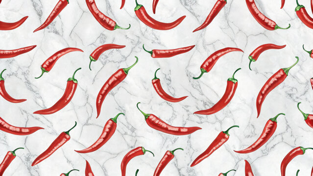 Seamless chili pepper pattern red spice illustration marble background watercolor style hot culinary motif vibrant food design playful repeat kitchen decor rustic texture fresh stem accents