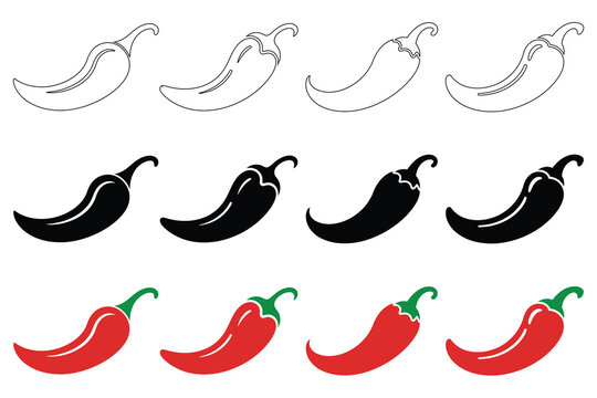 Set of minimalist black chili pepper spice silhouette vector icon
