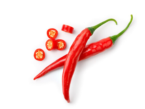 Flat lay of Two Red chili peppers with sliced isolated on white.