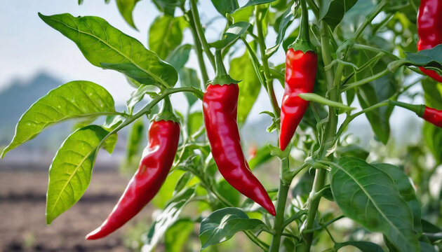 Red chili growing in the field, red chilies plants in the field
