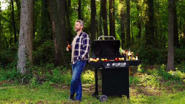 Middle-aged man cooking beef on the grill outdoors. Relaxing with beer and barbeque in nature. Man with grill and drink beer. Man grilled food in backyard. Man with bottle beer cooking near grill.