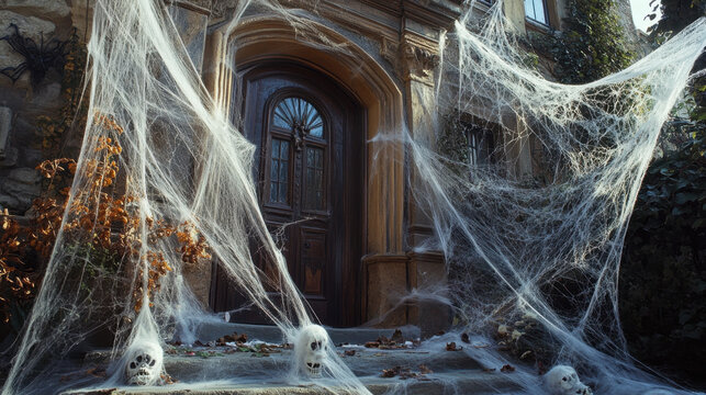 spooky entrance adorned with cobwebs and ghostly decorations creates eerie atmosphere perfect for Halloween. detailed architecture adds to haunting charm