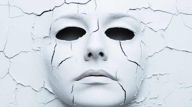Cracked Facade: A stark and haunting image of a white mask, its surface cracked and weathered, revealing the emptiness beneath. The mask's wide, hollow eyes stare out with a chilling intensity.