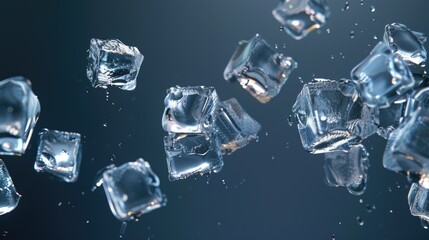 A close-up view of a group of ice cubes frozen in mid-air, appearing to float