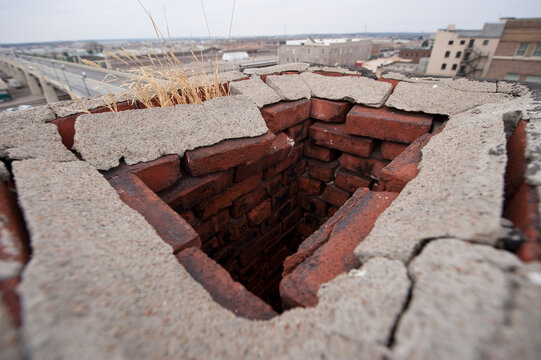 Top of an old brick chimney on a roof; Lincoln, Nebraska, United States of America