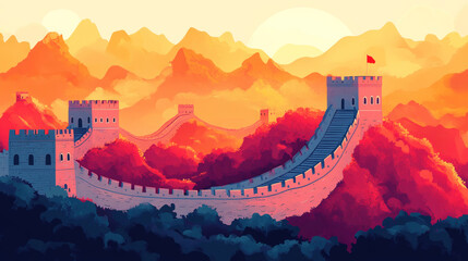 the Great Wall of China under the sky, sunset gradient background, minimalist style, china landscape wallpaper