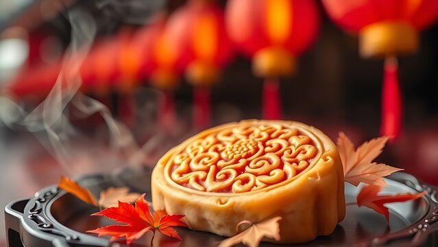 Steaming mooncake with ornate designs, paired with autumn leaves for China National Day.