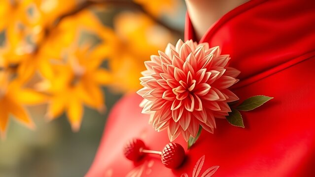 A chrysanthemum flower pinned to a ruby red cheongsam collar, with golden maple leaves in soft focus for China National Day.