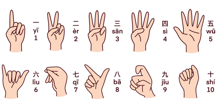 Educational vector chart with hand signs used in Chinese culture to represent numbers 1 to 10. Illustrated fingers with pinyin and characters for counting in Mandarin
