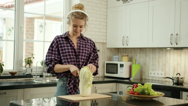 Caucasian woman slicing fresh chinese cabbage on cutting board in the kitchen. Slow motion of a woman listening to music and making salad. High quality 4k footage