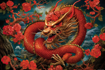 Chinese New Year 2024 modern art design in red, gold and white colors for cover, card, poster, banner with trendy geometric pattern. Hieroglyphics mean Happy New Year and symbol of of the Dragon