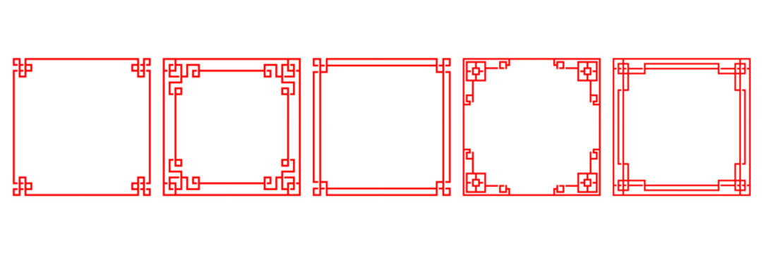 Set of traditional Asian square frames in red. Vector line art with classic ornamental designs. Perfect for borders, invitations, decorations, or cultural graphic elements.