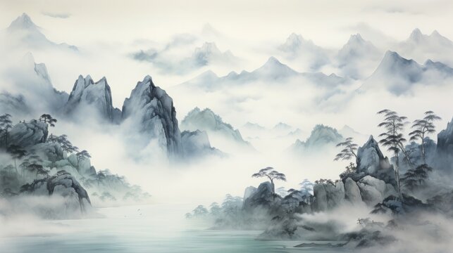 Watercolor painting abstract ink landscape mountain fog .Traditional chinese painting. asia art style.png.
