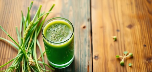 Vibrant green wheatgrass juice in glass, fresh young sprouts on wood,  healthy,  wellness