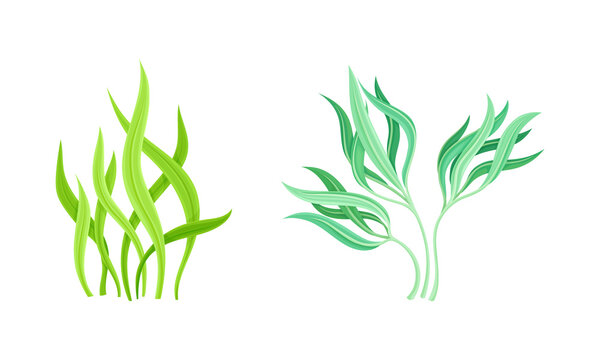 Seaweed and Algae as Aquatic and Marine Plants Growing on Ocean Bottom Vector Set.