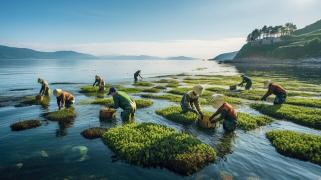 Sustainable seaweed farming practices with a photo of farmers tending to seaweed crops in an eco-friendly ocean garden