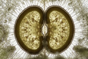 Brightfield microscopy of Desmid algae showing cell division in Micrasterias truncata - chlorophytes - desmidiacea