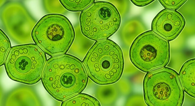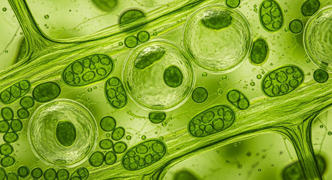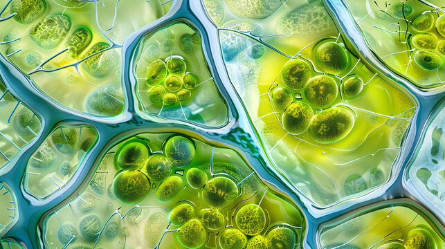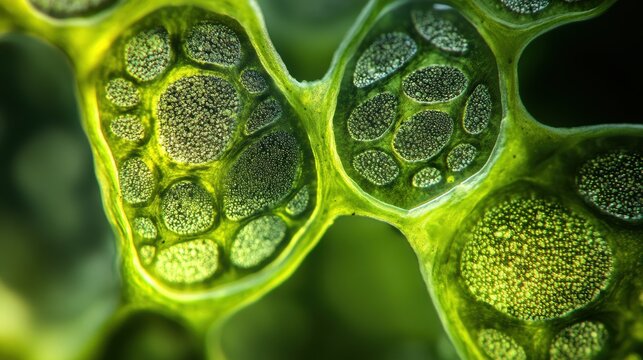 Detailed image of chloroplasts within plant cells, highlighting the green pigment and the process of photosynthesis
