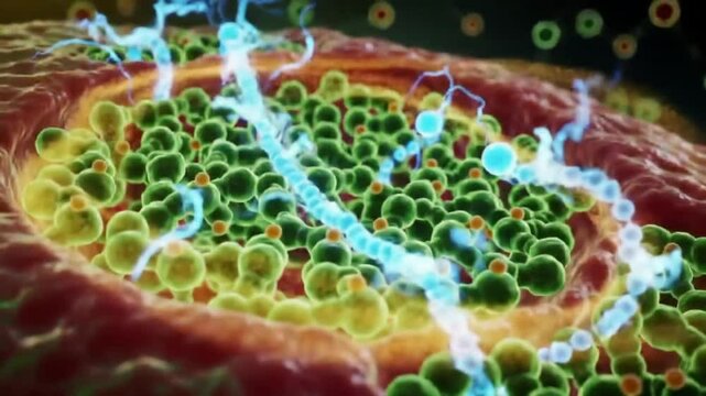 A vibrant 3D rendering of chloroplast DNA, shown within the chloroplasts of a plant cell. The background features a detailed representation of plant cell structures. Generative AI.