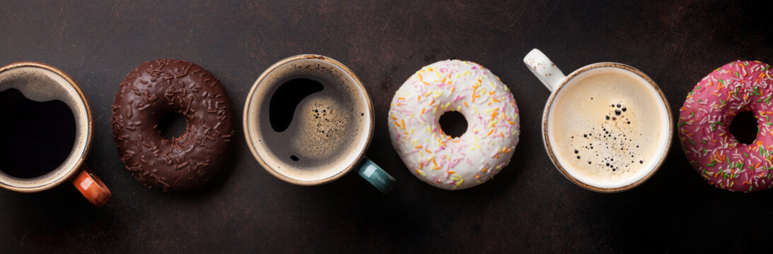 Donut or Doughnut. Two Donuts or Doughnuts with chocolate brown glazed cream or icing without sprinkles. Dessert on birthday, holiday party. Advertising coffee shop, bakery, cafe. American style Donut