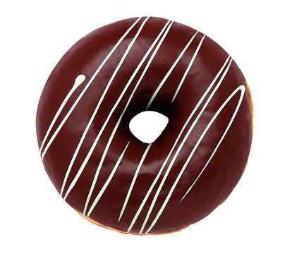 Chocolate glazed donut topped with dark chocolate drizzle and crunchy toffee bits on white background, isolated dessert for bakery and confectionery designs.