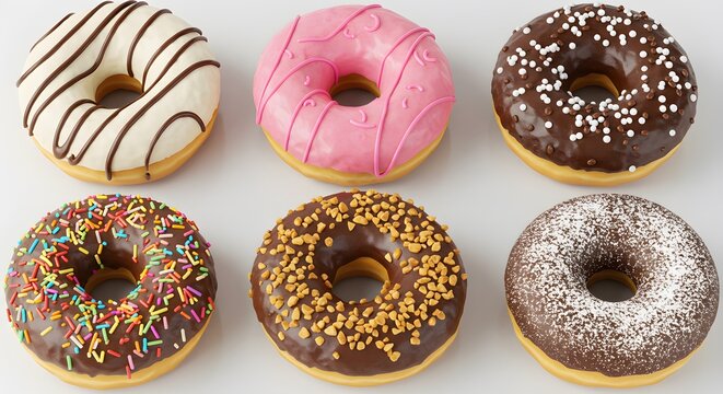 Variety of colorful donuts arranged in a row with different toppings and flavors displayed on a white background