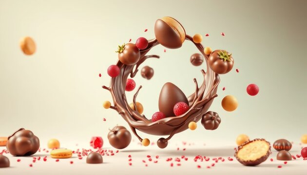Artistic Easter composition with chocolate eggs and a splash of chocolate