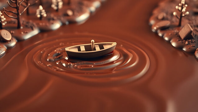 a small boat floating in a river of chocolate, surrounded by miniature trees. The scene is whimsical and inviting
