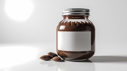 Chocolate spread jar with a blank label mockup displayed against a neutral brown studio background