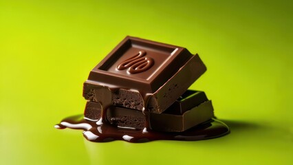 Melted dark chocolate squares stacked on a vibrant green background, with rich, glossy chocolate flowing from the top piece
