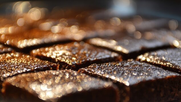 Close-up of squares of dark chocolatey baked goods, glistening with golden sparkle