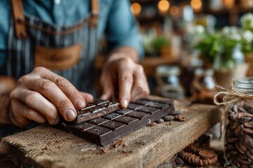 Chocolatier pouring melted chocolate into molds, cinematic close-up artisan dessert photography for luxury confectionery branding and marketing