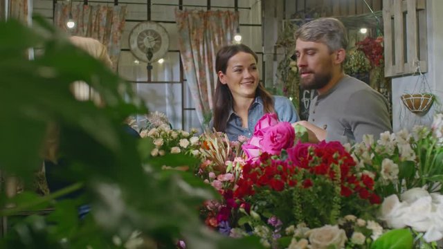 Couple of customers choosing bouquet in flower shop. Floral designer showing them beautiful composition and they buying it