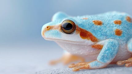 Cinematic Macro Close Up of a Blue Frog with Orange Spots and Detailed Eyes on a Soft Blue Background