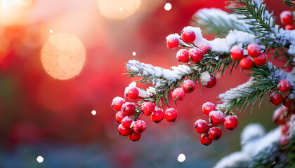 christmas tree in snow frosty holly berries nestled in the snow on chris vibrant red berries on a branch against a softly blurred red background in autumn