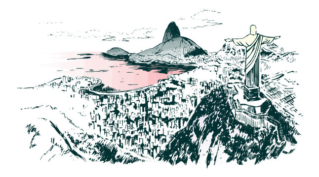Vector illustration of aerial view of Guanabara Bay, Rio de Janeiro, Brazil. Art in stripped lines, handmade, representing current times.