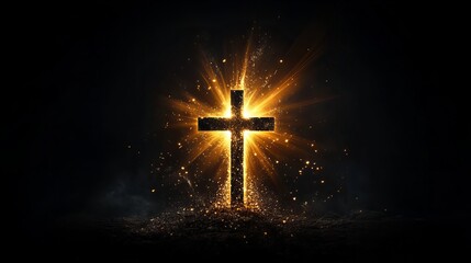 Christian cross glows with radiant light against a stark, dark background with golden particles.