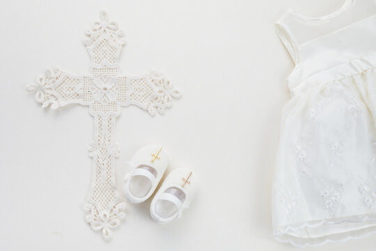 Christening background baby clothes dress, shoes, cross. Baptism celebration religious symbol. Newborn infant first holy communion announcement invitation card design. White flowers decor.